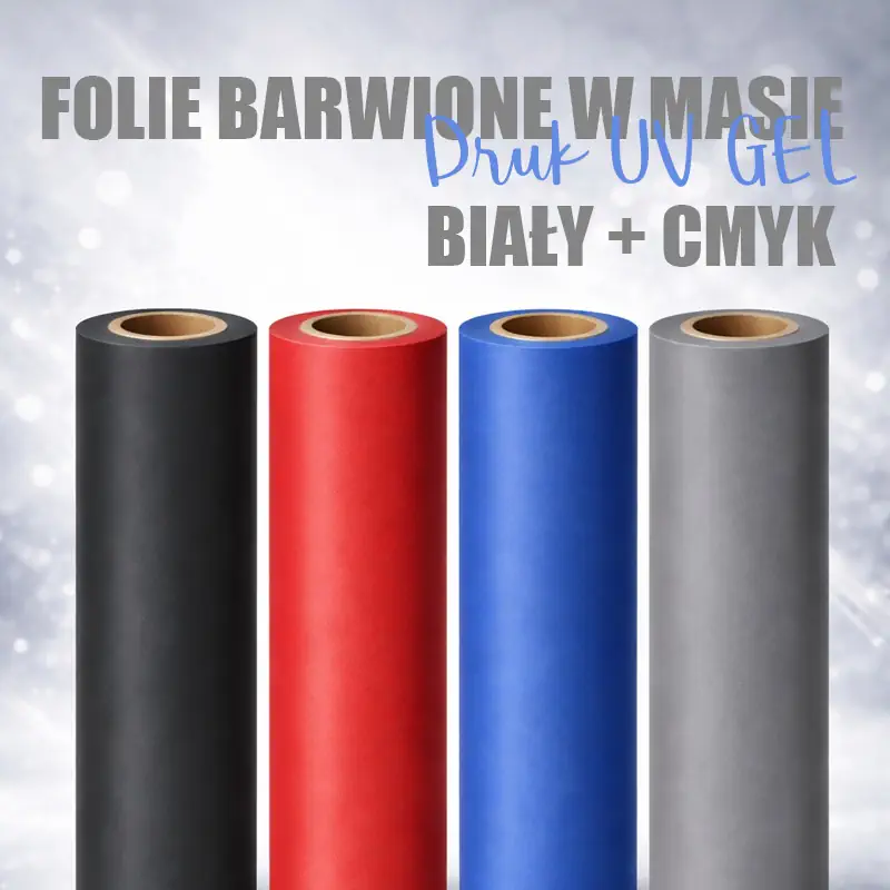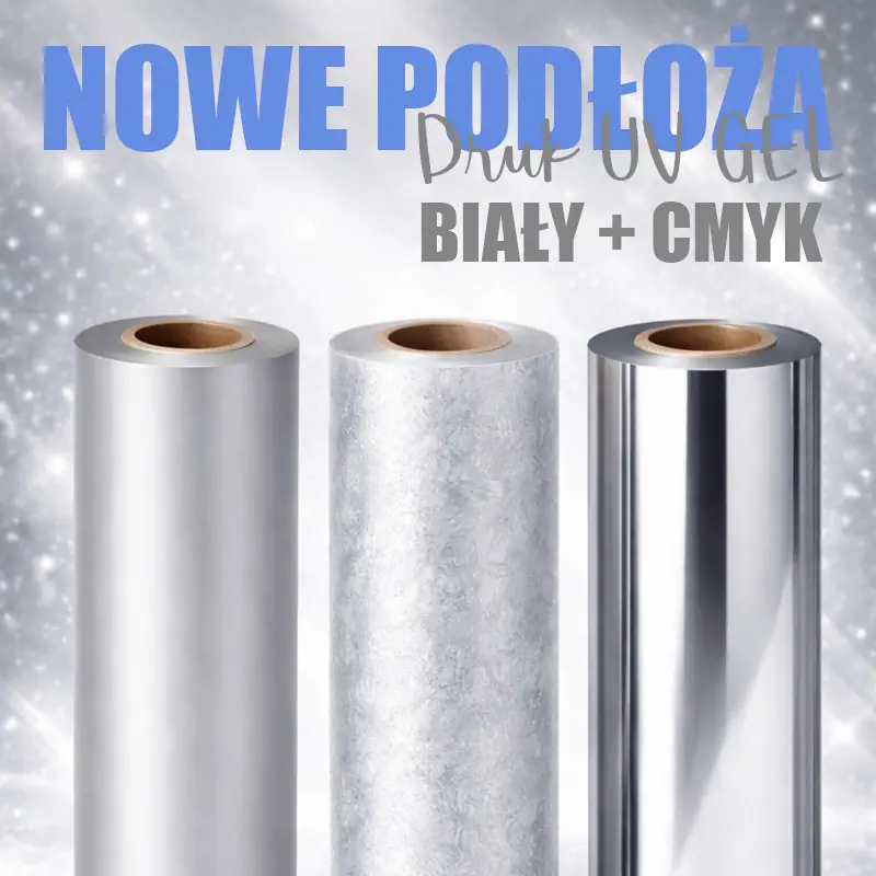 Fólie farbené v hmote, fólia strieborná a zrkadlová na potlač UV GEL s bielou farbou.